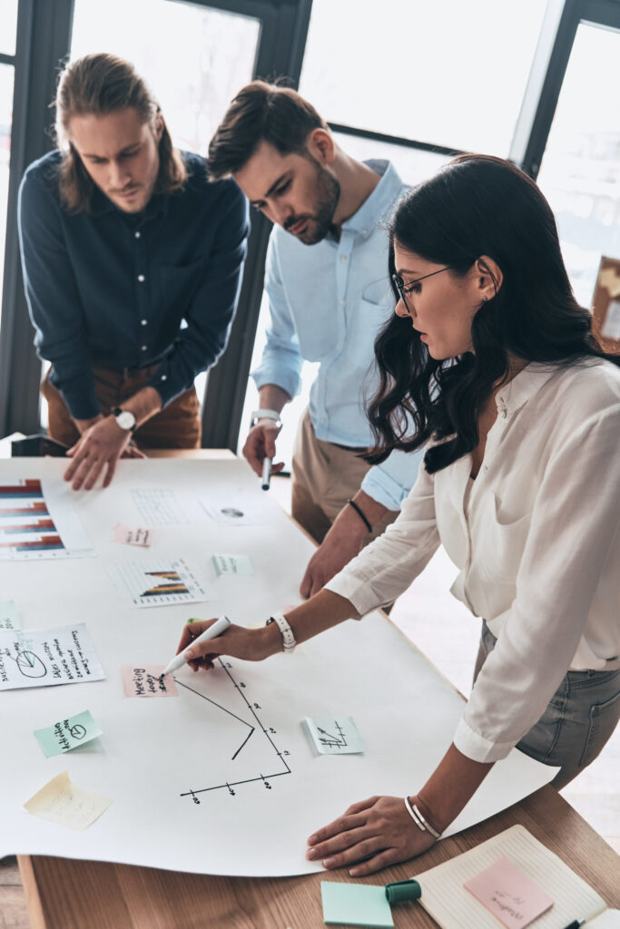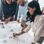 Team of innovators. Top view of young confident business people discussing something while working with blueprint in the office
